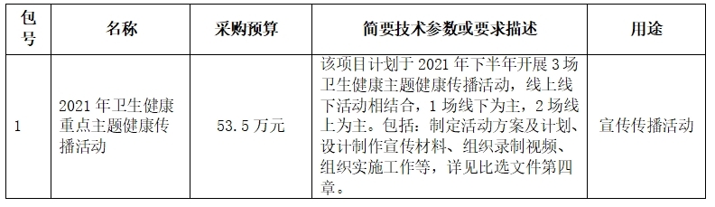 中国健康教育中心就“2021年卫生健康重点主题健康传播活动”进行比选采购,现邀请合格供应商参加比选响应。