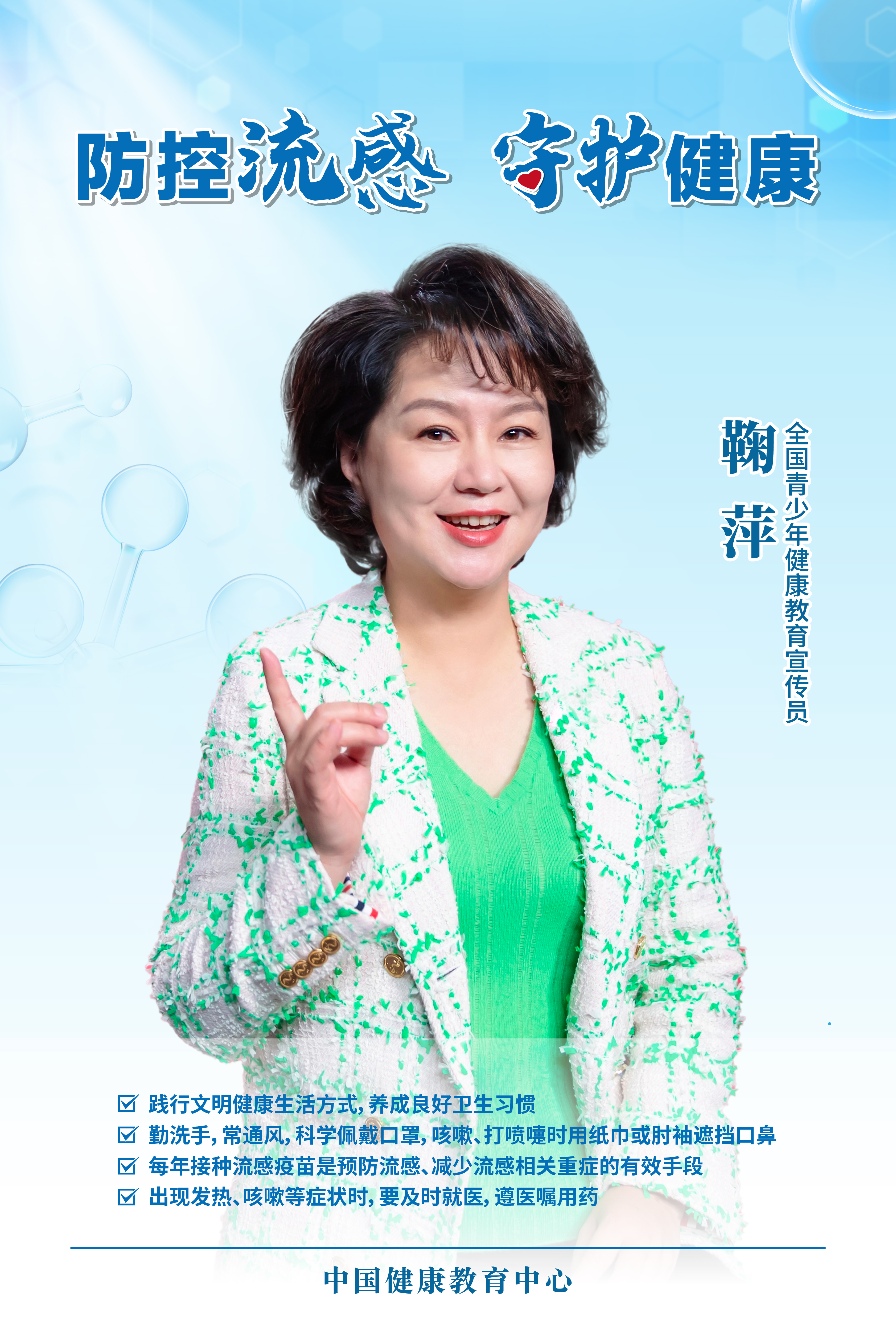 中国健康教育中心整理既往开发的邓亚萍和鞠萍参与的流感防控主题系列宣传海报,再次发布,以普及流感防护的健康知识,倡导健康生活方式,呼吁全社会关注、重视流感防控,守护健康。欢迎各地各机构传播使用。