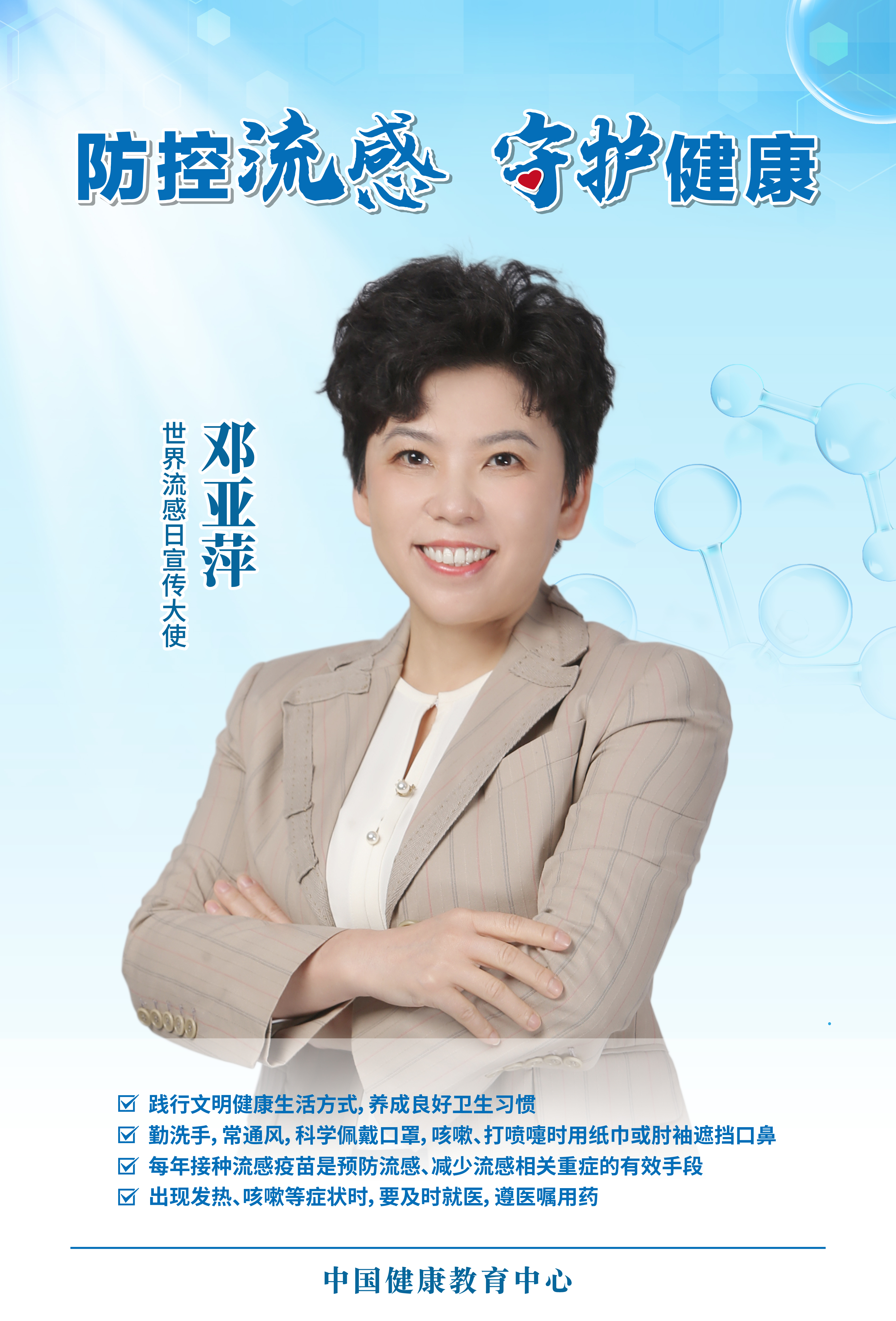中国健康教育中心整理既往开发的邓亚萍和鞠萍参与的流感防控主题系列宣传海报,再次发布,以普及流感防护的健康知识,倡导健康生活方式,呼吁全社会关注、重视流感防控,守护健康。欢迎各地各机构传播使用。